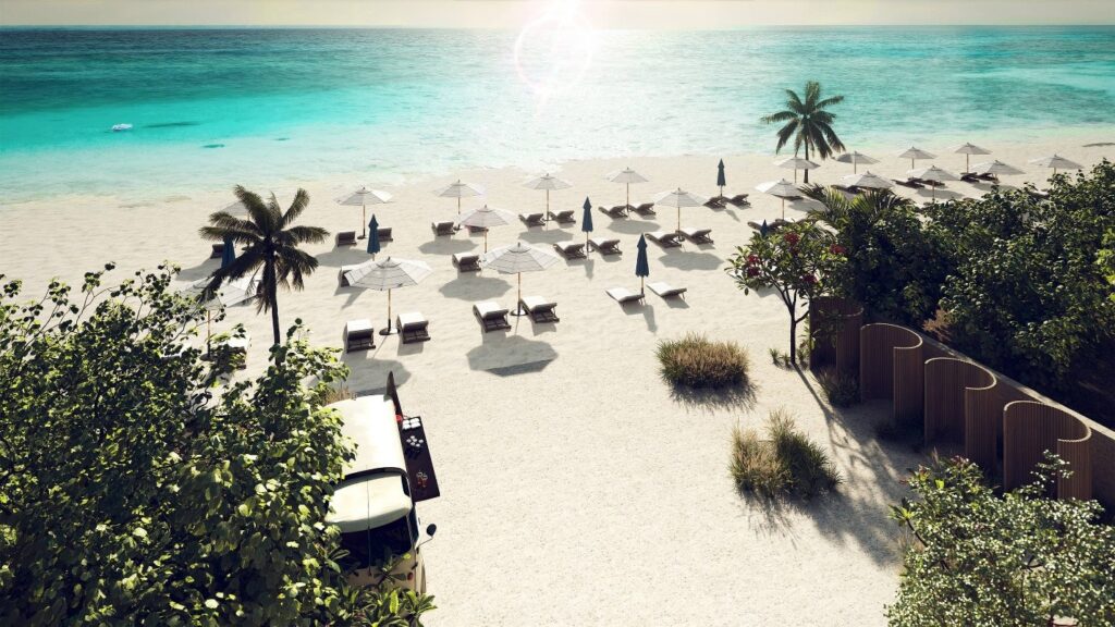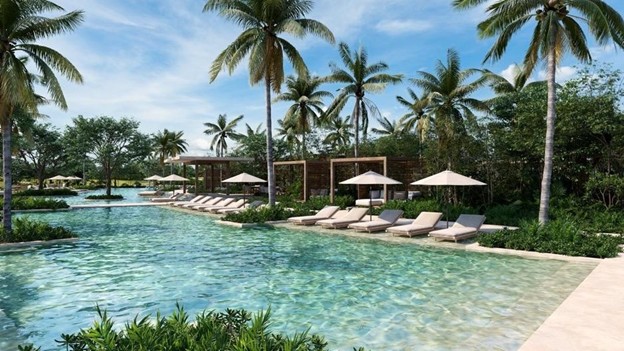 Above this render shows your beach area as envisaged by the developer. It’s just a few minutes in the complimentary shuttle or a golf cart from Punta Laguna. Renders shouldn’t be considered final, but give you an idea of what you can expect.